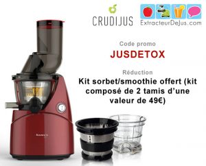 Pour l'achat d'un extracteur de jus Kuving's (B9400, B9700, C9500, D9900 ou encore le dernier EVO820) sur le site CrudiJus.fr, utilisez le code promo JUSDETOX pour bénéficiez du kit accessoire pour faire des smoothies et des sorbets (2 tamis) gratuitement. Simplement ajoutez le code promo JUSDETOX